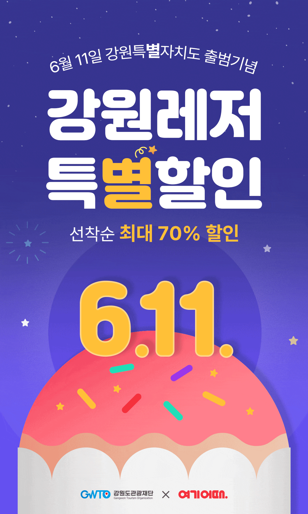 6월 11일부터 16일까지 총 6일동안 매일 오전 11시에 611명을 대상으로 강원도의 주요 유료 관광지 입장권을 균일가 6,110원으로 구매할 수 있는 프로모션을 진행합니다. 총 3.666명에게 선착순으로 제공되며 온라인 기획전 기간동안 복권긁기 이벤트를 통해 제공됩니다. '꽝 없는 복권긁기'를 통해 최대 70%까지 할인받을 수 있는 기회를 놓치지마세요. 또한 댓글, 공유와 설문조사 이벤트에 참여한 고객들에게 최대 2만원의 여기 어때 포인트 또는 강원도 블랙 숙박권을 제공하는 등 다양한 경품 이벤트도 함께 진행됩니다.