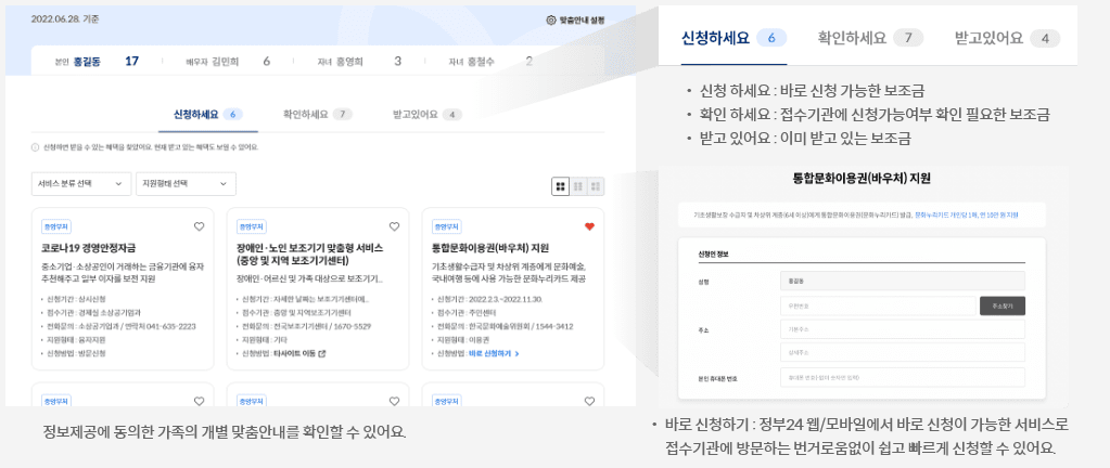 정부 24 site 에서 회원 가입 후 이용 가능합니다. 개인 또는 가족의 보조금 모두 신청 가능합니다.