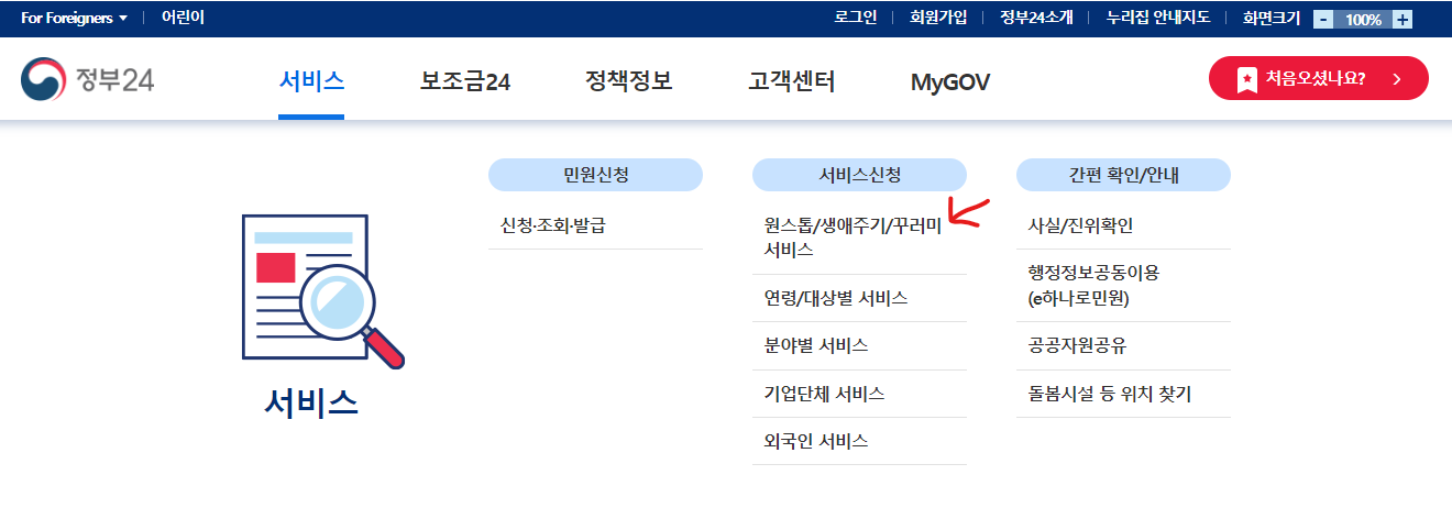 정부 24 (https://www.gov.kr/portal/main) 접속 로그인한 후 서비스>서비스신청>'원스톱서비스' 선택합니다.