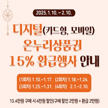혜택 2 | 디지털 (카드, 모바일) 온누리 상품권 15% 환급행사 13.4만원 구매시 4만원 할인 (구매할인 2만원 +환급 2만원) |